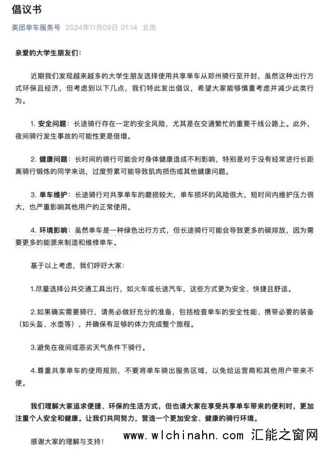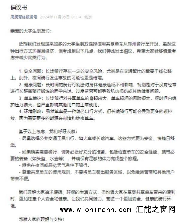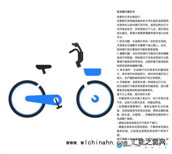 倡议书写道:夜骑一定要注意安全问题、健康问题、单车维护和环境影响。基于以上考虑,我们呼吁大家:尽量选择公共交通工具出行,如果确实需要骑行,请务必做好充分的准备,包括检查单车的安全性能、携带必要的装备(如头盔、水壶等),并确保有足够的体力完成整个旅程。避免在夜间或恶劣天气条件下骑行。尊重共享单车的使用规则,不要将单车骑出服务区域,以免给运营商和其他用户带来不便。