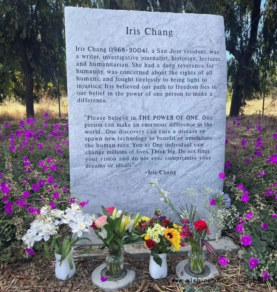 在美国加州圣何塞张纯如公园入口处,她的墓碑前几盆鲜花在风中摇曳。旧金山抗日战争史实维护会会长李玲说:“张纯如虽然离开我们 20 年了,但是她的灵魂与我们同在,激励着我们下一代人铭记历史、捍卫和平。”