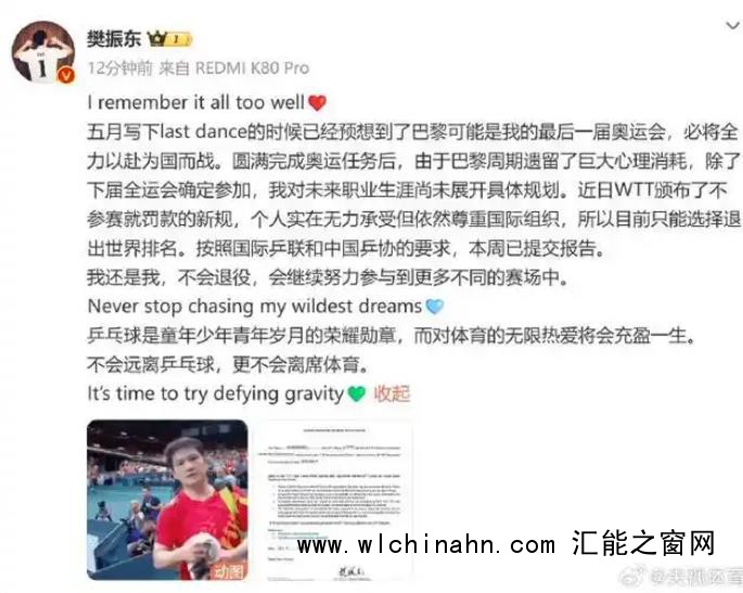 在巴黎奥运会获得乒乓球男单、男团冠军成就大满贯的樊振东发微博宣布,将退出世界排名,但不会退役。