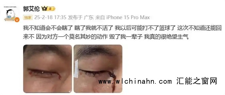 2月18日,知名篮球运动员郭艾伦晒出眼睛受伤流血的照片,称“我以后可能打不了篮球了”。