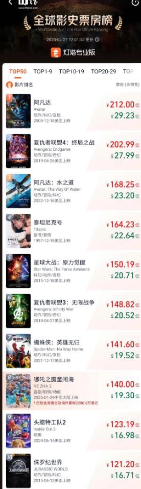IT之家 2 月 27 日消息,据灯塔专业版数据,《哪吒之魔童闹海》全球票房突破 140 亿元,当前位列全球影史票房第 8,即将超过《蜘蛛侠:英雄无归》(141.6 亿元)。