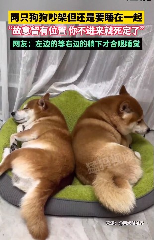 两只狗狗吵架了,但是还是要睡在一起,网友:故意留有位置,你不进来就死定了。左边的等右边的躺下才合眼睡觉。