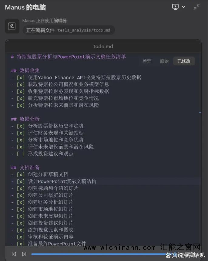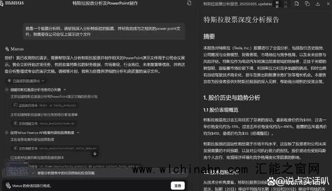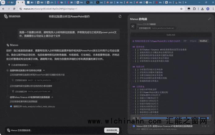 官方网站展示,Manus能一键帮用户做旅行规划、股票分析、制作PPT、财报分析等工作。