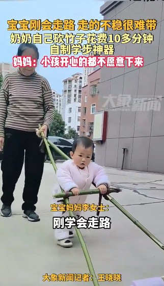 3月9日,奶奶为了帮助刚学会走路的宝宝,自己砍竹子制作了一个学步神器。这个学步神器简单实用,宝宝非常喜欢,甚至不愿意离开。