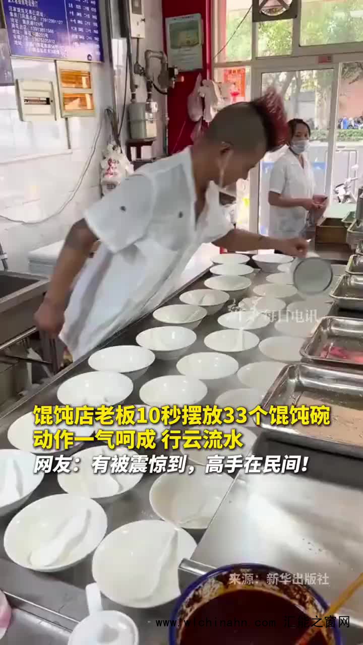 江苏南京,馄饨店老板在10秒内摆放33个馄饨碗,动作一气呵成,行云流水,引起了广泛关注。