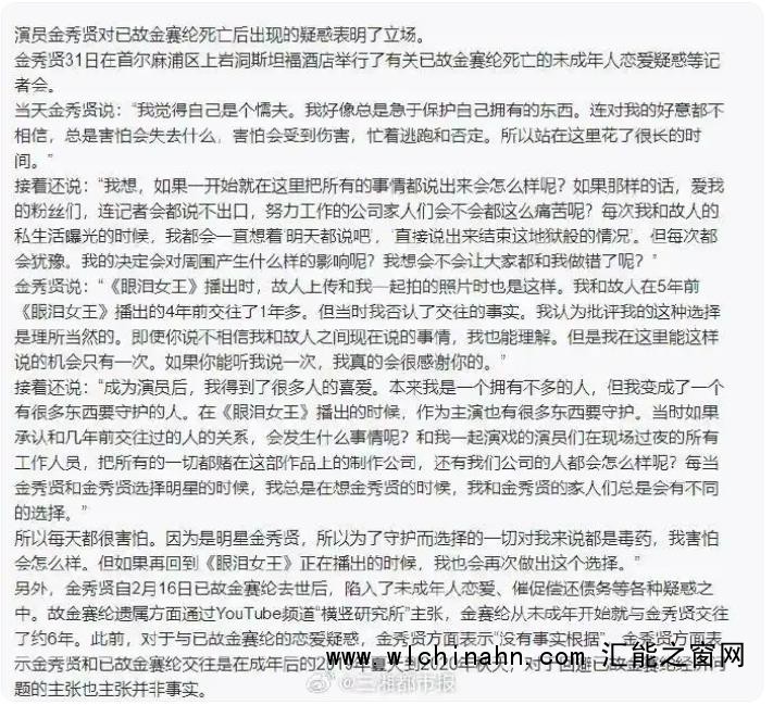 金秀贤边哭边说解释为何否认恋情:“因为我是明星金秀贤,我要守护的东西很多。所以我选择的一切都让我担忧和害怕,但是如果时间能倒流回《眼泪女王》上映的时候,我依然会选择当时那样做(否认与金赛纶恋情),我只能那么去做,我甘愿承受被叫胆小鬼。”