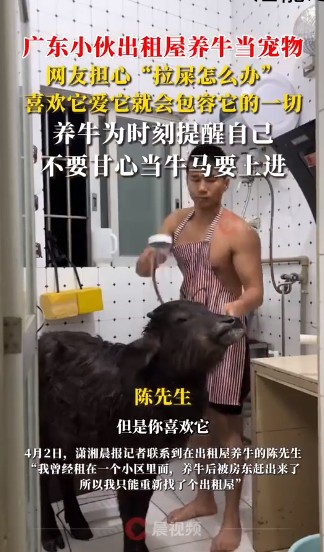 近日,广东佛山一男子在网上发布其在出租屋养牛的视频引发广大网友关注。视频中,男子对牛的照顾可谓是无微不至,不仅贴心地为牛洗澡,还给牛穿上了衣服。小牛也会在每天男子回来时在门口等他。有网友感到疑惑,“你在出租屋养牛房东知道吗?”