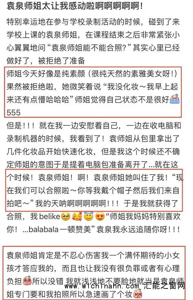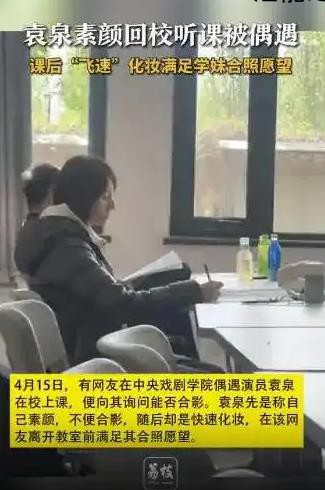 这位网友说,自己在学校参加一个录制活动的时候,碰巧遇到了正在中戏上课的袁泉师姐。当时这位网友想跟袁泉合个影,结果袁泉笑着说她没化妆,拒绝了。没想到等拍摄结束之后,袁泉从包包里拿出化妆品,迅速化了个妆。就在那位网友准备离开的时候,袁泉喊住了她,说:“现在我们可以拍照啦!”这个小细节真的让这位网友感动得不得了。