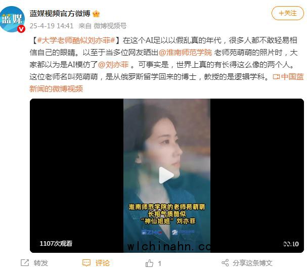 【#大学老师酷似刘亦菲#】在这个AI足以以假乱真的年代,很多人都不敢轻易相信自己的眼睛。以至于当多位网友晒出@淮南师范学院 老师苑萌萌的照片时,大家都以为是AI模仿了@刘亦菲 。可事实是,世界上真的有长得这么像的两个人。这位老师名叫苑萌萌,是从俄罗斯留学回来的博士,教授的是逻辑学科。来源:中国蓝新闻的微博视频