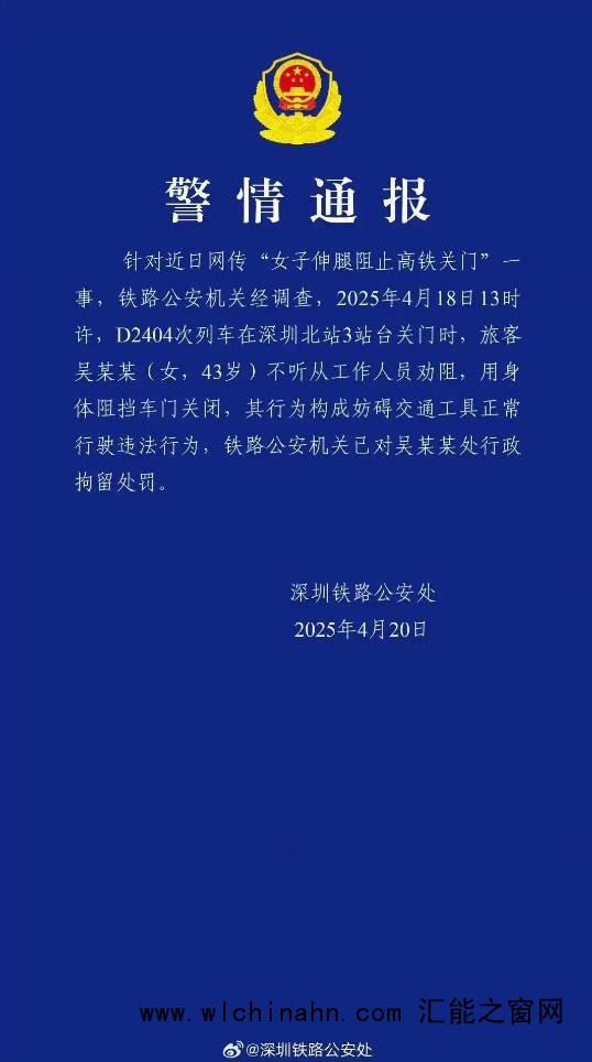4月18日13时许,由东莞南站开往厦门站的D2404次列车停靠在深圳北站3站台准备发出。正当列车车门缓缓关闭时,车内一名女子因同行人还未上车,竟强行用身体阻挡车门,阻止列车关门发车。