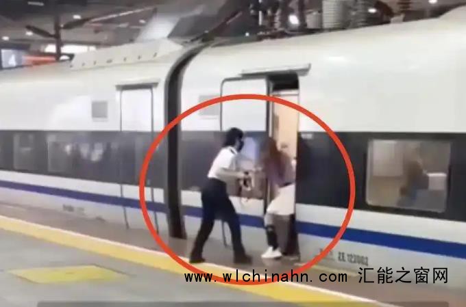 现场两名铁路工作人员见状立即上前制止,但女子情绪激动,全然不顾工作人员的劝阻和其他乘客焦急的目光。直到女子的三名同行人赶到,女子这才离开车门,随后列车关门驶离。