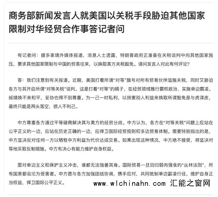 商务部新闻发言人就美国以关税手段胁迫其他国家限制对华经贸合作事答记者问。