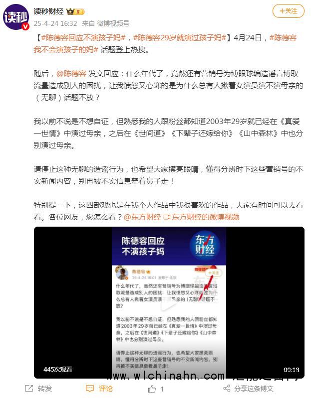 随后,@陈德容 发文回应:什么年代了,竟然还有营销号为博眼球编造谣言博取流量造成别人的困扰,让我愤怒又心寒的是为什么总有人揪着女演员演不演母亲的(无聊)话题不放?