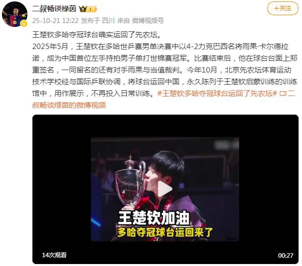 2025年5月,王楚钦在多哈世乒赛男单决赛中以4-2力克巴西名将雨果·卡尔德拉诺,成为中国首位左手持拍男子单打世锦赛冠军。比赛结束后,他在球台台面上郑重签名,一同留名的还有对手雨果与当值裁判。今年10月,北京先农坛体育运动技术学校经与国际乒联协调,将球台运回中国,永久陈列于王楚钦启蒙训练的训练馆中,用作展示,不再投入日常训练。#王楚钦多哈夺冠球台运回了先农坛#来源:二叔畅谈绿茵的微博视频