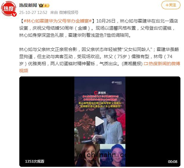 温馨!林心如霍建华为父母举办金婚宴,霍建华素颜出席状态佳!