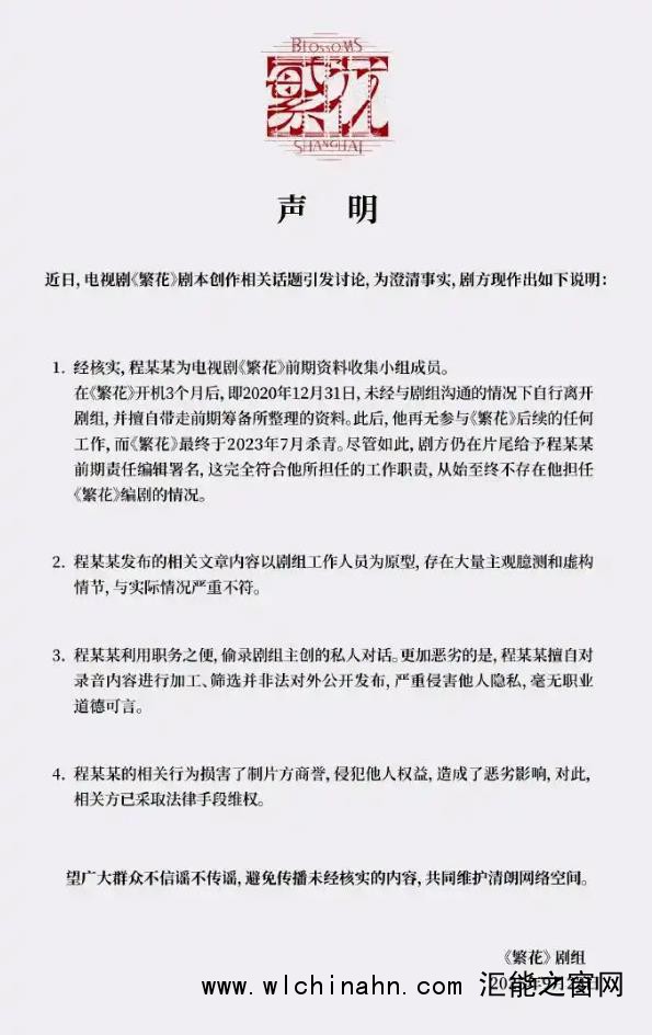 1.经核实,程某某为电视剧《繁花》前期资料收集小组成员。在《繁花》开机3个月后,即2020年12月31日,未经与剧组沟通的情况下自行离开剧组,并擅自带走前期筹备所整理的资料。此后,他再无参与《繁花》后续的任何工作,而《繁花》最终于2023年7月杀青。尽管如此,剧方仍在片尾给予程某某前期责任编辑署名,这完全符合他所担任的工作职责,从始至终不存在他担任《繁花》编剧的情况。2.程某某发布的相关文章内容以剧组工作人员为原型,存在大量主观测和虚构情节,与实际情况严重不符。3.程某某利用职务之便,偷录剧组主创的私人对话。更加恶劣的是,程某某擅自对录音内容进行加工、筛选并非法对外公开发布,严重侵害他人隐私,毫无职业道德可言。4.程某某的相关行为损害了制片方商誉,侵犯他人权益,造成了恶劣影响,对此,相关方已采取法律手段维权。望广大群众不信谣不传谣,避免传播未经核实的内容,共同维护清朗网络空间。