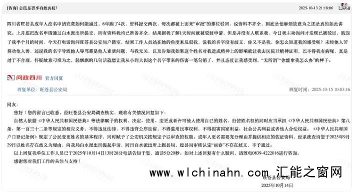 记者致电旺苍县公安局,相关工作人员表示,目前改名工作是依据该规程,同时结合《中华人民共和国民法典》有关规定综合办理。公安局已再次联系该网友,让其补充医院开具相关精神证明,以此佐证原有姓名对其心理和精神造成伤害,并在该网友补全资料后,通过其改名申请。