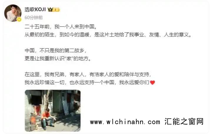矢野浩二发文称,“二十五年前,我一个人来到中国。从最初的陌生,到如今的温暖,是这片土地给了我事业、友情、人生的意义。中国,不只是我的第二故乡,更是让我重新认识‘家’的地方。在这里,我有兄弟,有家人,有‘浩家人’的爱和陪伴与支持,我永远珍惜这一切,也永远支持一个中国,我永远爱你们”。