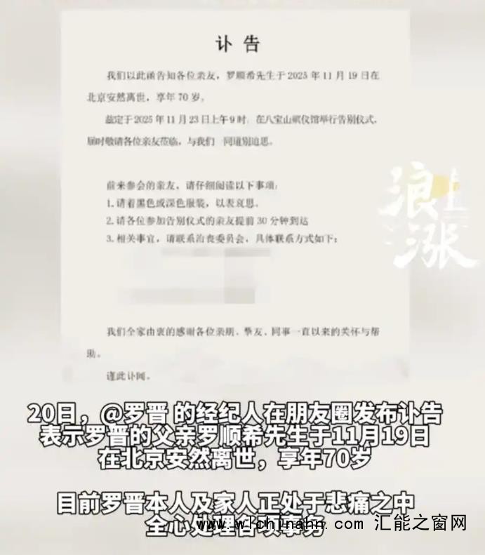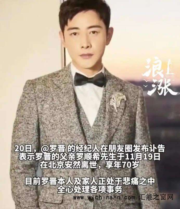 11月20日,罗晋经纪人在朋友圈发讣告:“我们的好朋友罗晋先生的父亲罗顺希先生于11月19日在北京安然离世,享年70岁。罗先生本人及家人正陷于悲痛及各项事务之中,特代其发布讣告。”