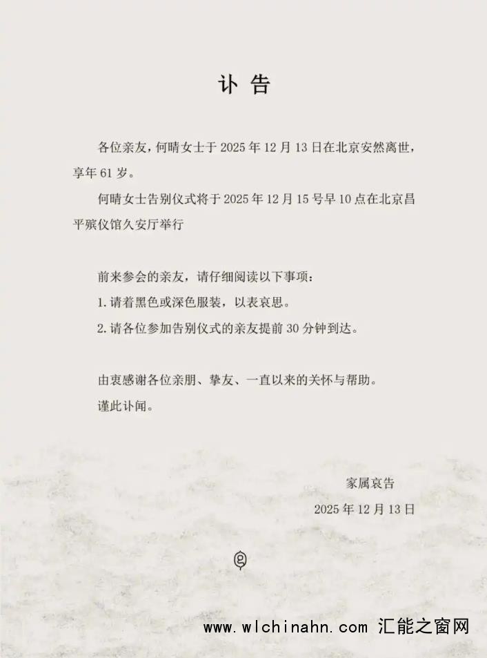 据扬子晚报消息,12月13日,一份家属发布讣告显示,著名演员何晴在北京安然离世,享年61岁。告别仪式将于2025年12月15号早10点在北京昌平殡仪馆久安厅举行。