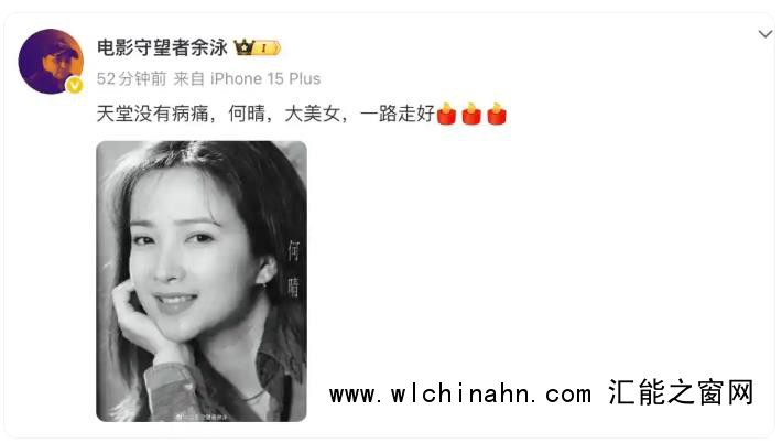 “电影守望者余泳”向记者证实了这一消息,他于社交平台发布何晴的黑白肖像照,并配文“天堂没有病痛,何晴,大美女,一路走好”,引发网友与演艺圈人士的集体缅怀。余泳透露,何晴生病后一直希望低调,让大家永远记住她美好的形象。