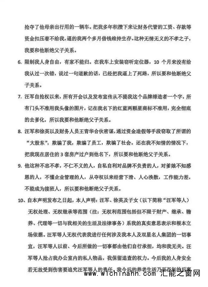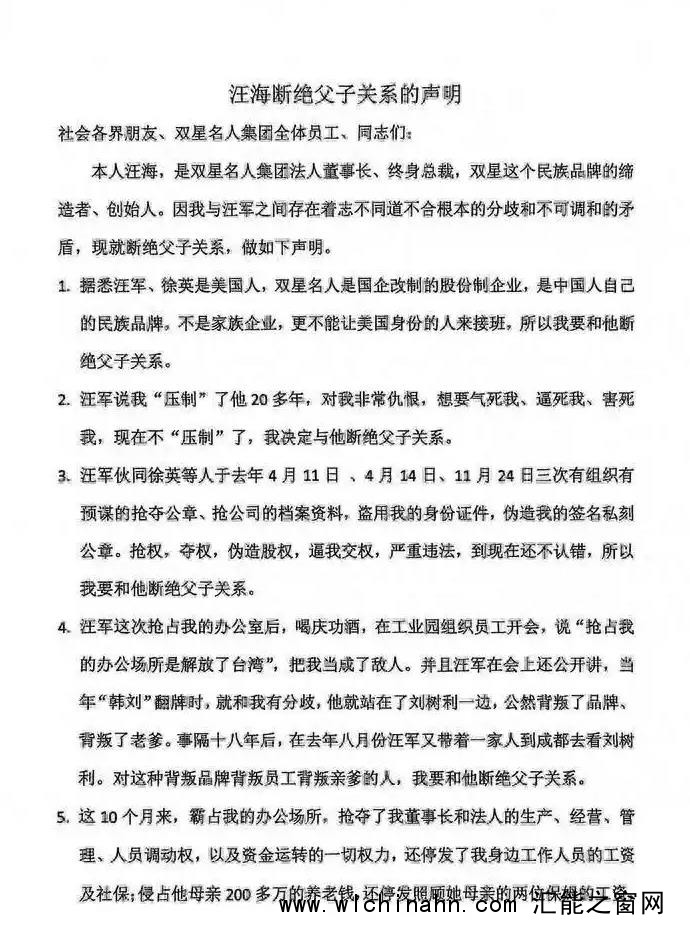 除了国籍问题,汪海还痛斥儿子掌权后搞“去创始人化”。据他描述,汪军在抢占办公室后喝庆功酒,甚至在员工大会上公然宣称“抢占办公场所……”,将父亲视为敌人。