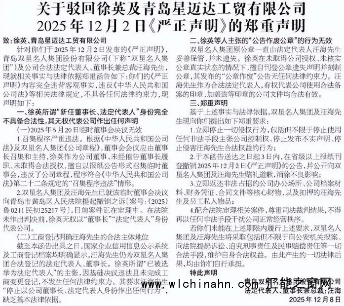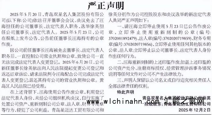 2025年12月2日,儿媳徐英率先出招。她以“双星名人董事长”及控股股东青岛星迈达的名义发布《严正声明》。徐英披露了夺权的依据:公司于当年5月20日召开董事会,决议免去了汪海的董事长及法定代表人职务,并选举她接任。
