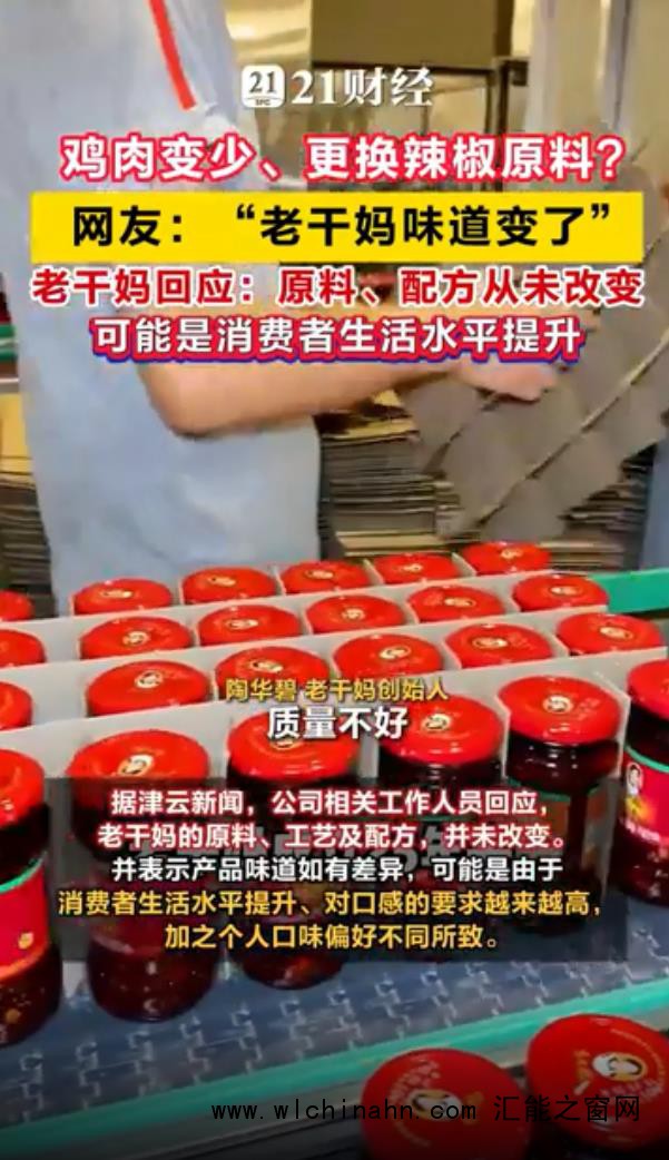针对味道变了的质疑,据津云新闻,贵阳南明老干妈风味食品有限责任公司相关工作人员进行回应,其否认了为节约成本而调整原料的说法,并表示产品味道如有差异,可能是由于消费者生活水平提升、对口感的要求越来越高,加之个人口味偏好不同所致。工作人员同时强调,老干妈的原料、工艺及配方,并未改变。