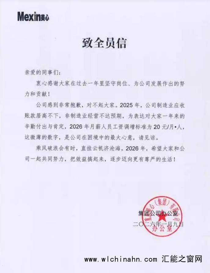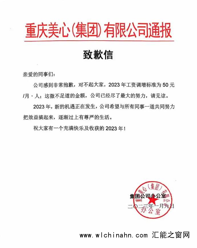 近日,重庆美心集团一份关于2026年度调薪的致歉信受到关注。信中称,今年公司决定为基层员工涨20元月薪,并对涨幅较低表达歉意,“非常抱歉,对不起大家”。