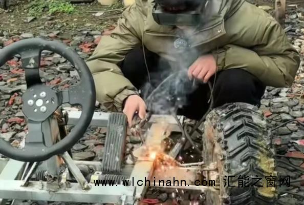 这辆车用钢管焊接车架,后轮毂电机驱动,电池藏在座位下。从二手市场淘来电机、轮胎、控制器,加上自购的电焊机、电钻,总成本约800元,用的全是自己攒的压岁钱。