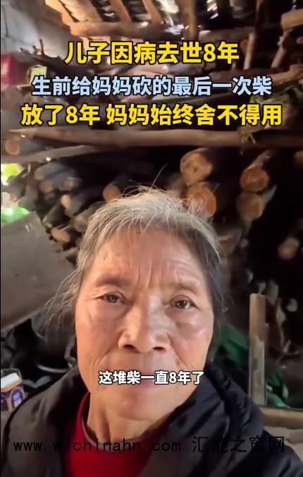 #母亲回应不舍烧儿子去世前砍的柴#3月14日(采访时间),四川宜宾。儿子因病去世8年,生前为妈妈砍的最后一次柴,放了8年,妈妈始终舍不得用。王女士称:“我儿子已经走了8年了,每一次他要出门打工前,都会给我办好烧一年的柴,这堆柴一直8年了,我都舍不得烧,每次我看到这堆柴,就想起我儿子过年回家来。”来源:纵览新闻的微博视频